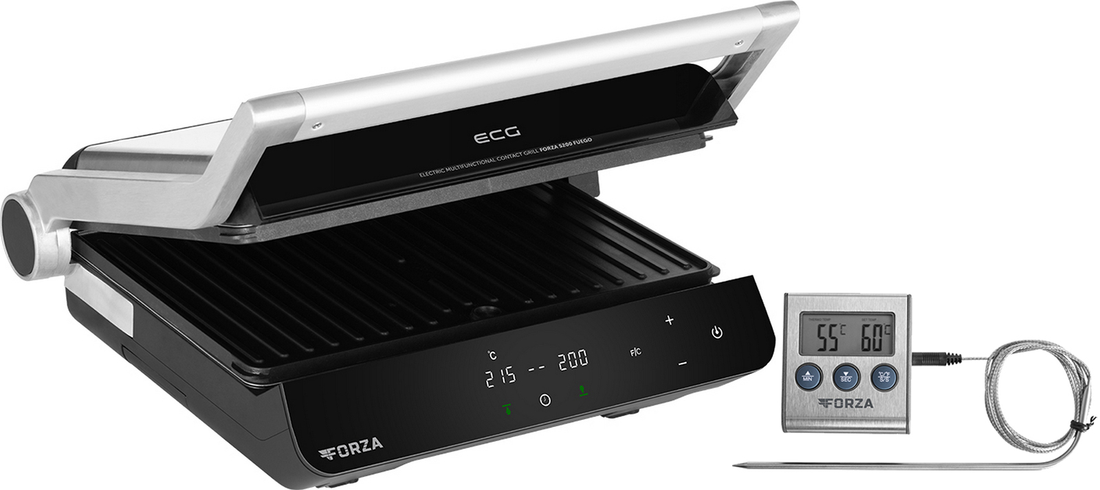 Kontaktní gril • příkon 2000 W • nepřilnavé grilovací desky (ploché/žebrované) • maximální teplota 230 °C • rozměr grilovacích desek 240 × 330 mm • 2 nezávislé termostaty • 3 provozní polohy • časovač • vyjímatelné a snadno omyvatelné grilovací desky • sběrný zásobník na odkapávaný tuk • digitální ovládání • externí teplotní sonda • možnost rozevření do 180° • tepelně izolovaná madla • světelná a zvuková signalizace • škrabka na čištění • 100cm napájecí kabel • 18 × 40 × 38 cm