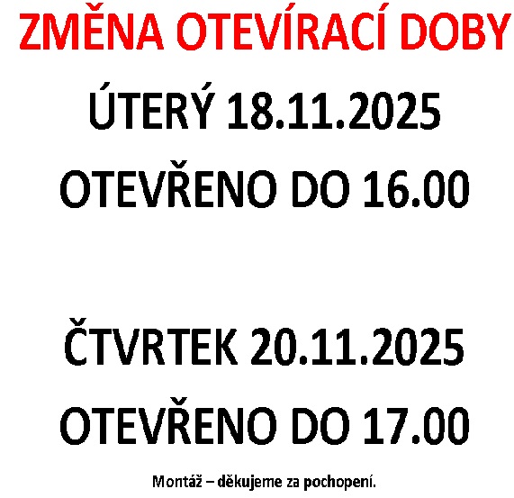ZMĚNA OTEVÍRACÍ DOBY V TOMTO TÝDNU 18.11. – 21.11.2025